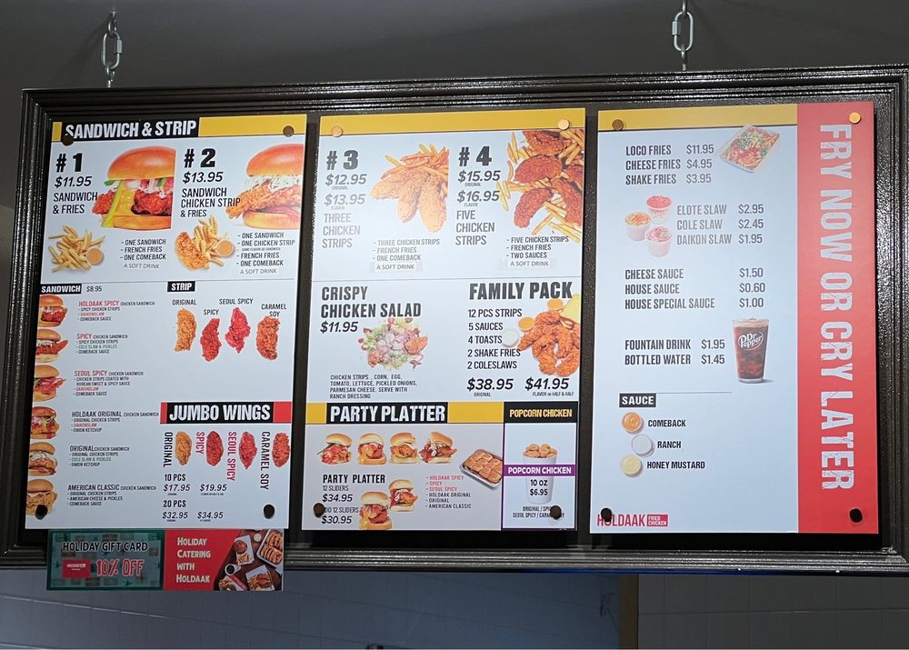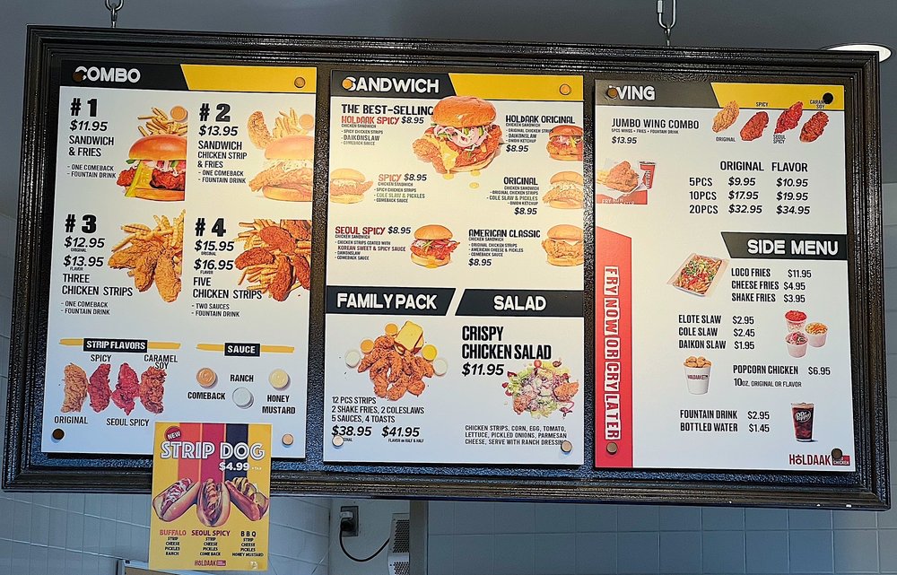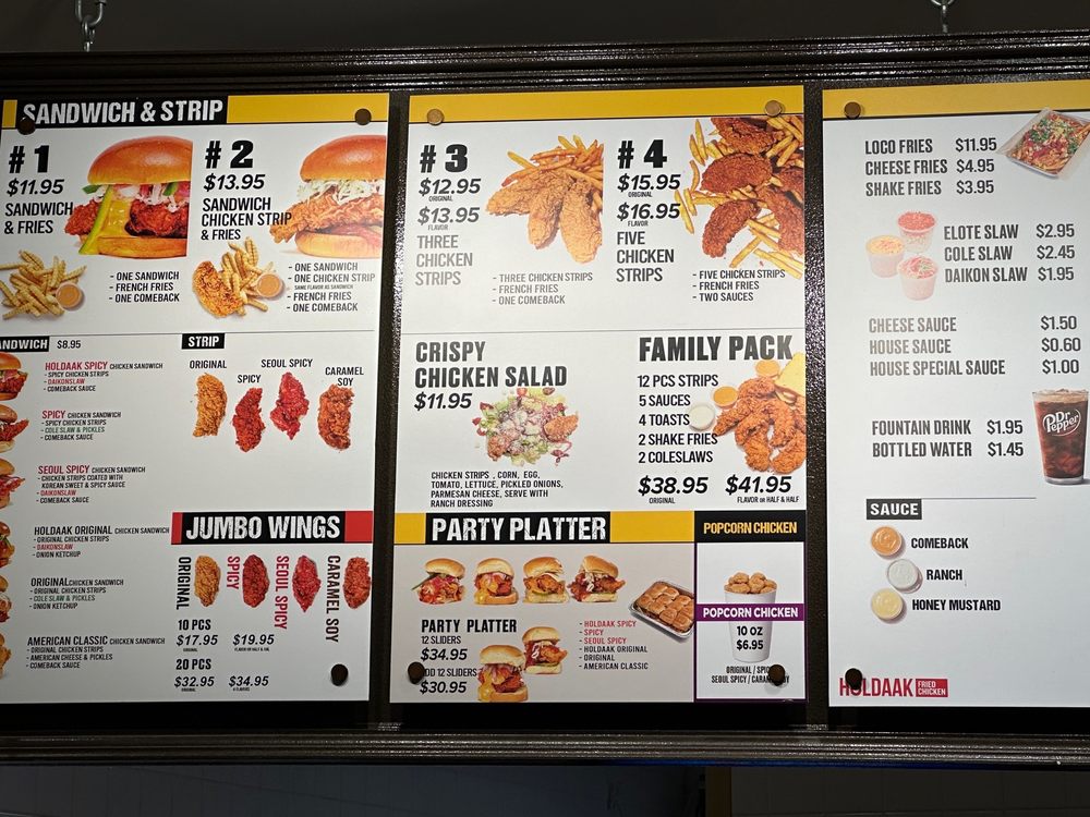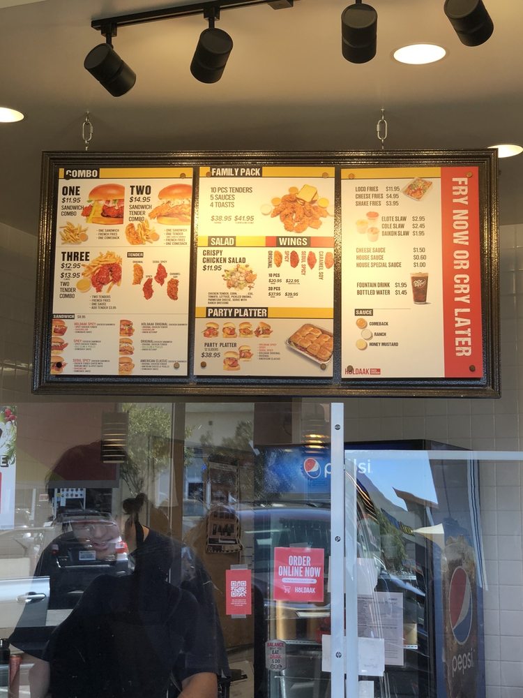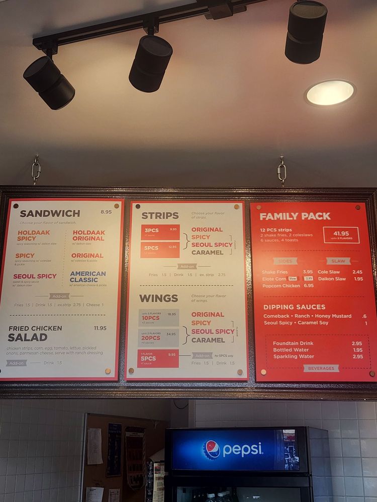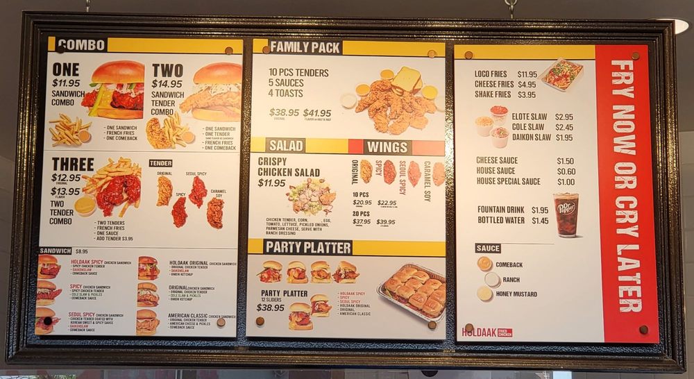 Holdaak Fried Chicken, located in Fullerton, CA, offers a variety of options for both dine-in and takeout. With a menu featuring signature sandwiches like the Holdaak Spicy Chicken and Original Chicken, as well as chicken strips and salads, there is something for everyone. Customers have raved about the flavor explosions of the juicy chicken, especially highlighting the spicy options. The friendly service and quick turnaround time have also been praised, making it a top choice for chicken lovers in the area. Whether you're in the mood for a classic chicken sandwich or looking to spice things up with the Seoul spicy sauce, Holdaak Fried Chicken is a must-try spot for flavorful and satisfying meals.